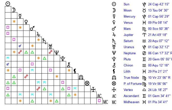 | Sun | 24 Capricorn 41 | 25 Capricorn 34 | 23 Taurus 57 |