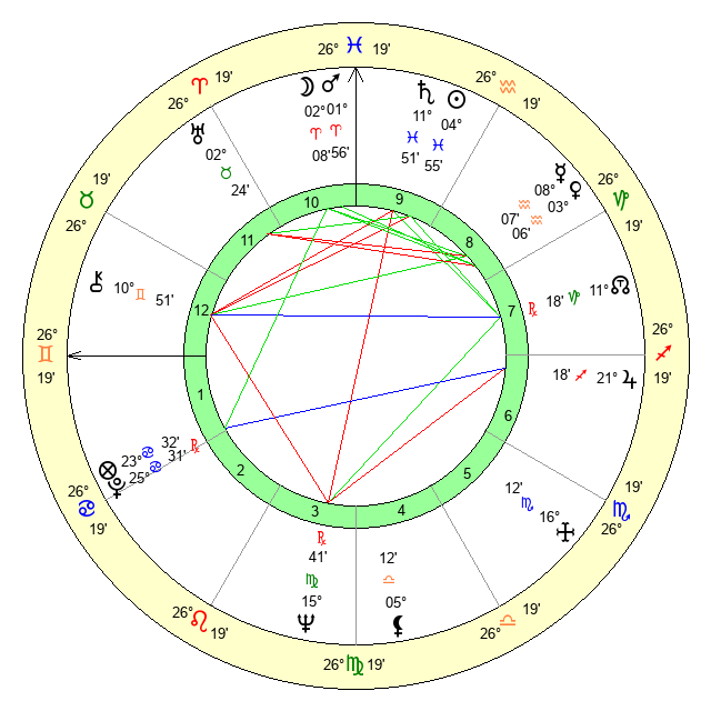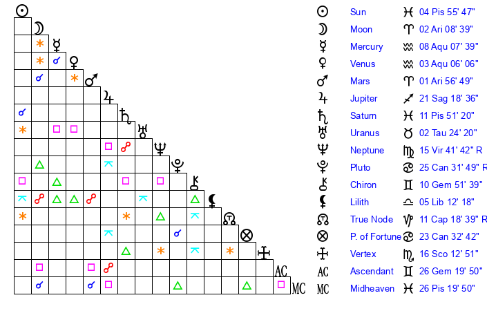 | Sun | 4 Pisces 55 | 6 Pisces 20 | 2 Gemini 21 |