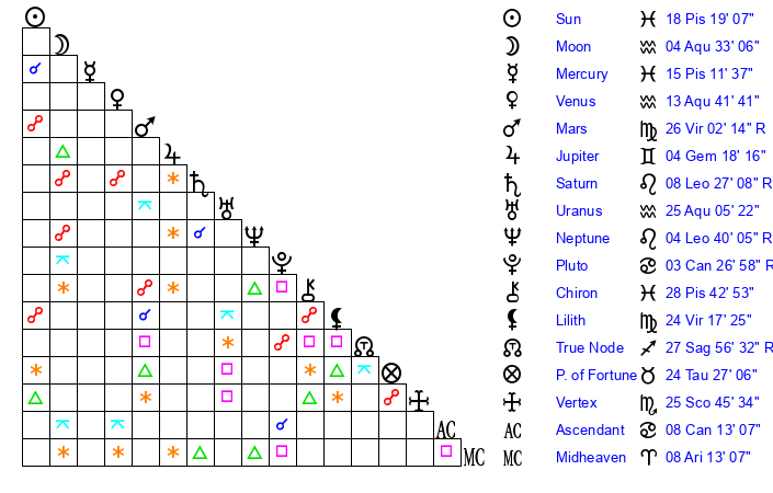 | Moon | 4 Aquarius 39 | 26 Cancer 47 | 5 Capricorn 43 |