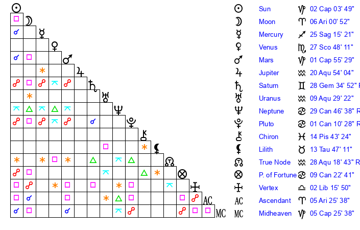 | Moon | 6 Aries 3 | 25 Aquarius 42 | 26 Aries 2 |