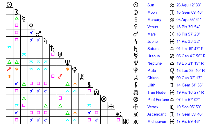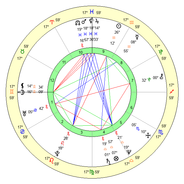 | Moon | 16 Gemini 6 | 2 Libra 31 | 7 Pisces 1 |