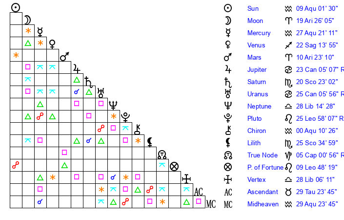 | Moon | 19 Aries 27 | 12 Aquarius 20 | 16 Scorpio 10 |