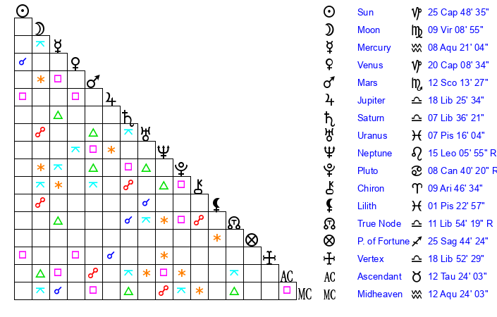 | Venus | 20 Capricorn 9 | 13 Pisces 50 | 28 Taurus 21 |