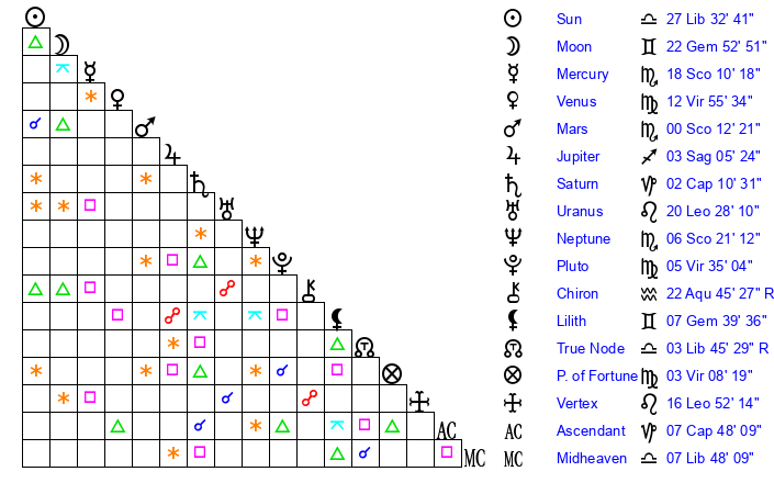 | Pluto | 5 Virgo 34 | 1 Aquarius 22 | 6 Virgo 4 |