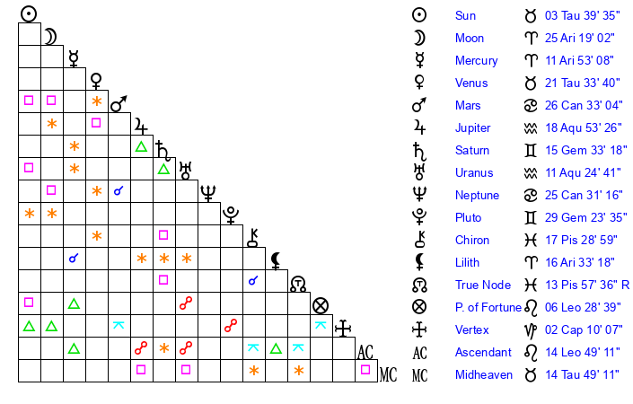| Moon | 25 Aries 17 | 21 Pisces 16 | 16 Taurus 22 |