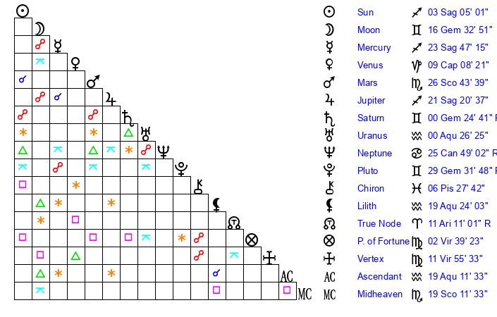 | Sun | 3 Sagittarius 5 | 3 Sagittarius 41 | 27 Pisces 30 |