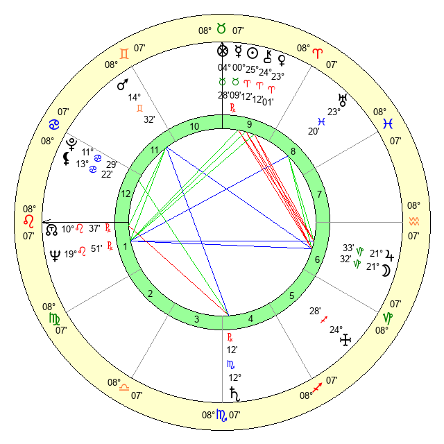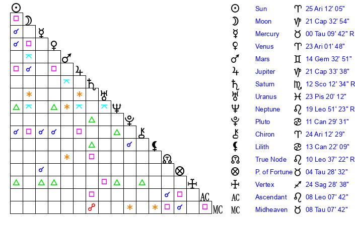 | Neptune | 19 Leo 51 | 0 Aries 35 | 21 Leo 31 |