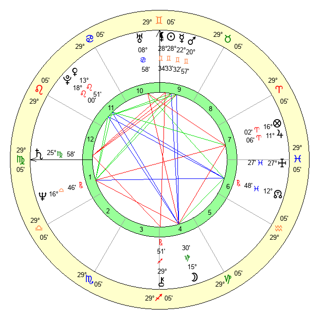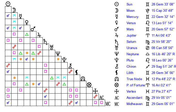 | Sun | 28 Gemini 33 | 29 Gemini 37 | 9 Virgo 24 |