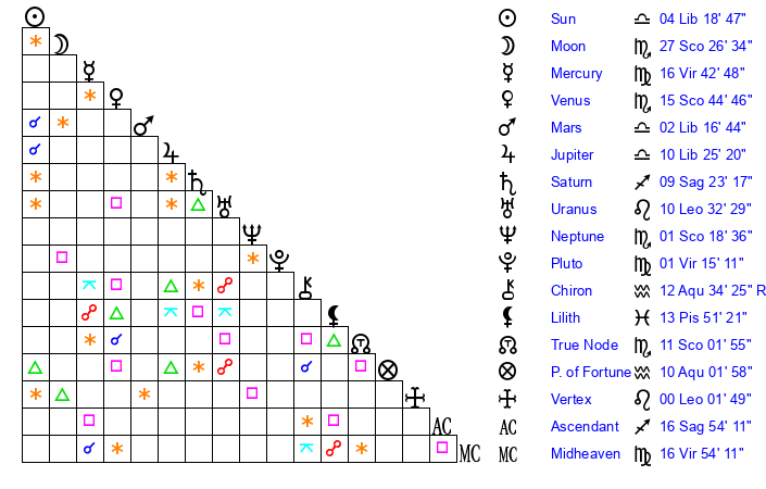 | Moon | 27 Scorpio 26 | 9 Sagittarius 37 | 12 Taurus 1 |