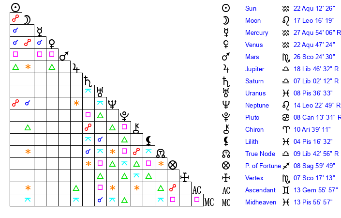 | Neptune | 14 Leo 22 | 28 Pisces 17 | 13 Leo 25 |