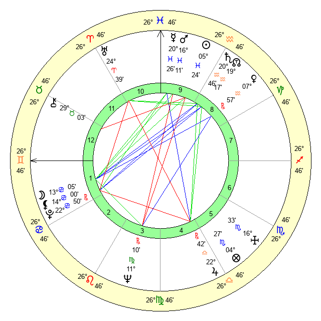 | Sun | 5 Pisces 24 | 6 Pisces 20 | 4 Gemini 44 |