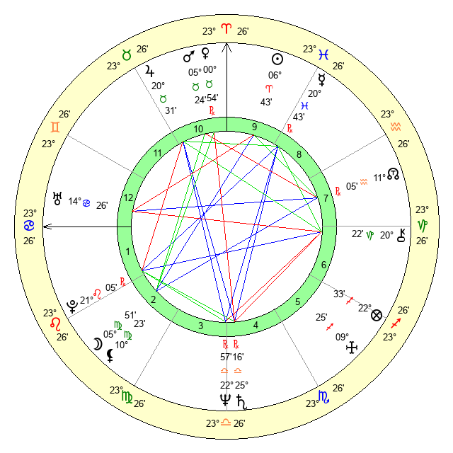 | Moon | 5 Virgo 48 | 12 Pisces 58 | 26 Aries 0 |
