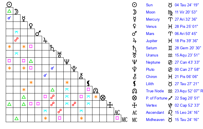 | Sun | 4 Taurus 24 | 5 Taurus 44 | 19 Leo 50 |