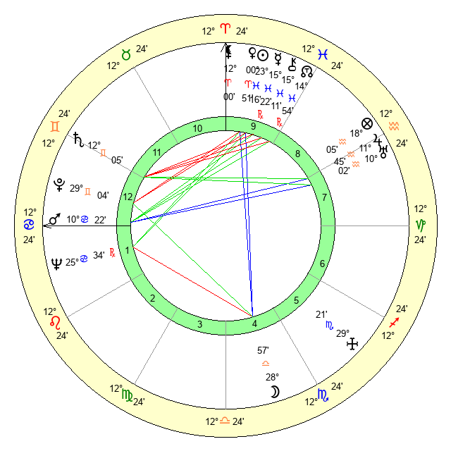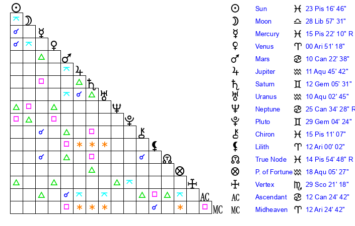 | Sun | 23 Pisces 17 | 24 Pisces 22 | 10 Cancer 53 |