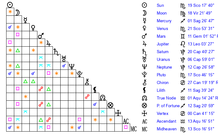 | Sun | 19 Scorpio 17 | 20 Scorpio 3 | 23 Sagittarius 43 |