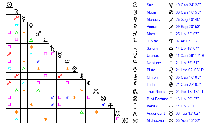| Mercury | 26 Sagittarius 50 | 3 Capricorn 16 | 19 Aries 53 |