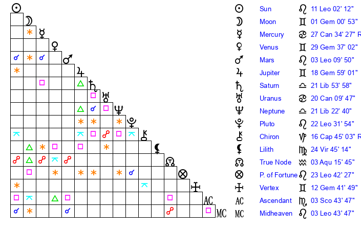 | Mars | 3 Leo 10 | 27 Virgo 58 | 18 Virgo 51 |
