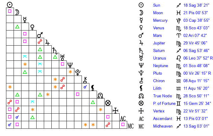 | Saturn | 7 Sagittarius 18 | 25 Pisces 12 | 13 Sagittarius 45 |