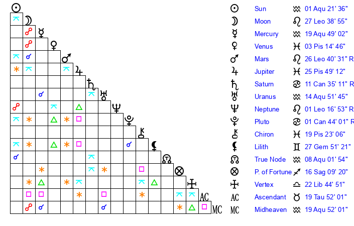| Neptune | 1 Leo 17 | 27 Pisces 43 | 0 Leo 7 |