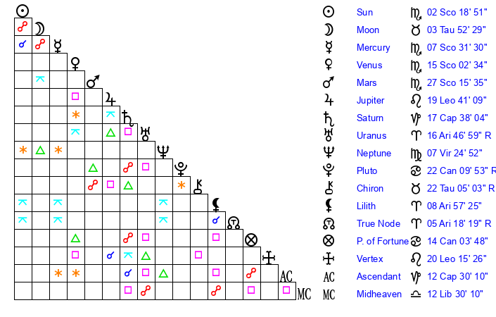 | Sun | 2 Scorpio 19 | 3 Scorpio 32 | 7 Aquarius 35 |