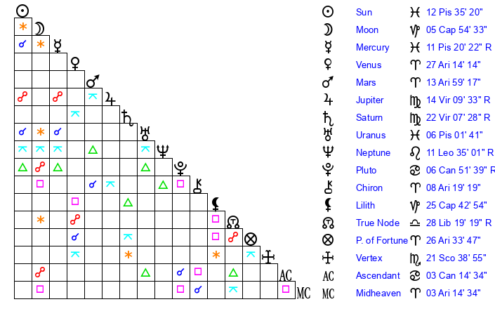 | Sun | 12 Pisces 35 | 13 Pisces 22 | 24 Gemini 1 |