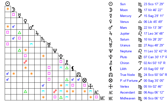 | Sun | 23 Scorpio 17 | 24 Scorpio 35 | 10 Pisces 49 |
