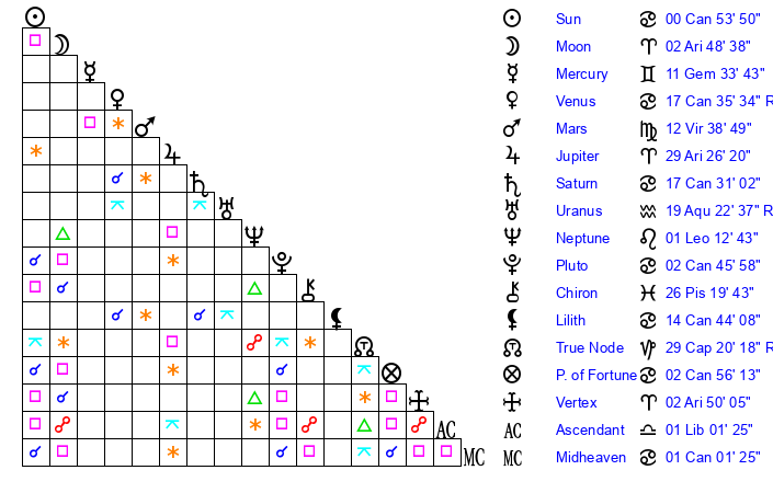 | Saturn | 18 Cancer 11 | 1 Aries 28 | 0 Leo 17 |