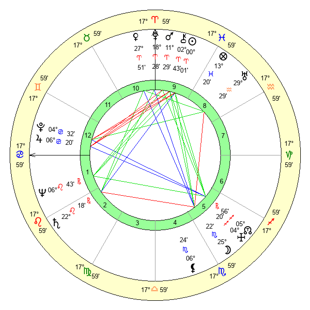 | Sun | 0 Aries 2 | 1 Aries 20 | 12 Cancer 36 |