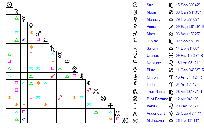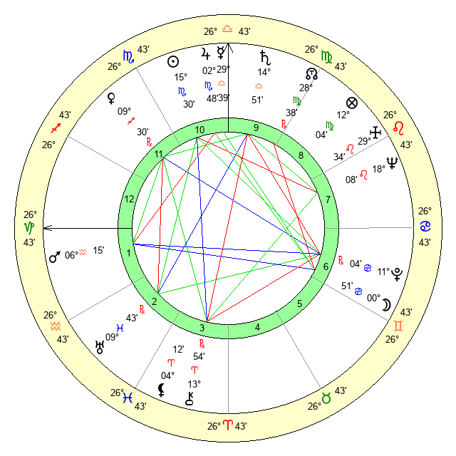 | Saturn | 15 Libra 27 | 25 Pisces 23 | 20 Libra 24 |