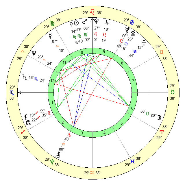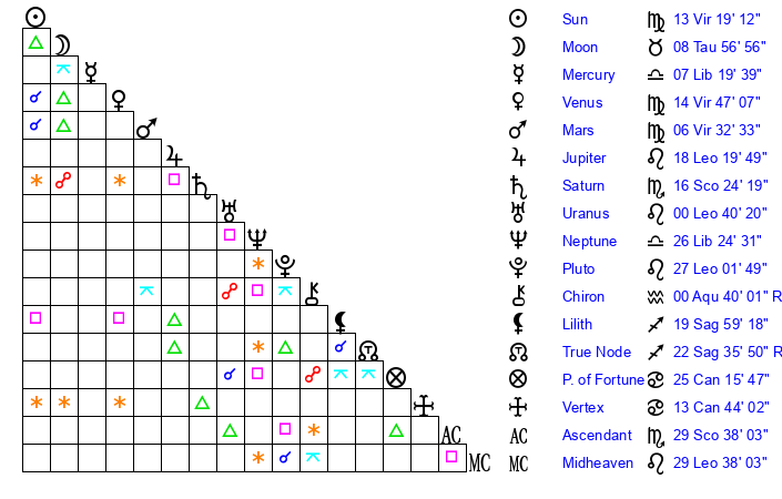 | Sun | 13 Virgo 19 | 14 Virgo 21 | 22 Scorpio 33 |