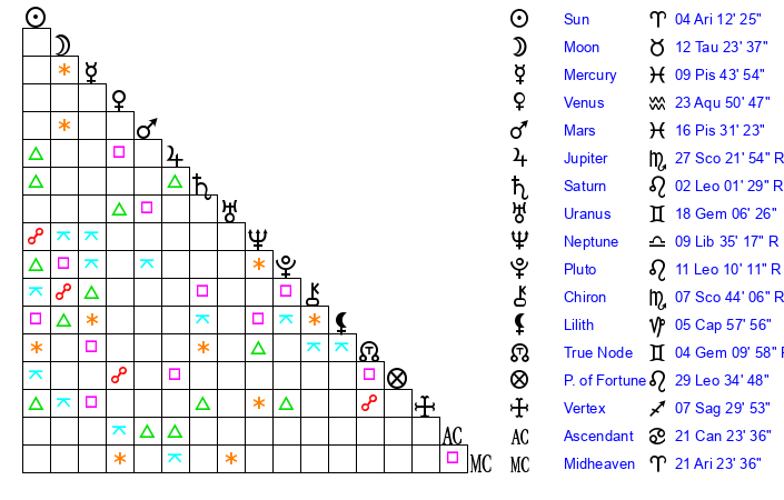 | Sun | 4 Aries 12 | 5 Aries 18 | 19 Gemini 55 |