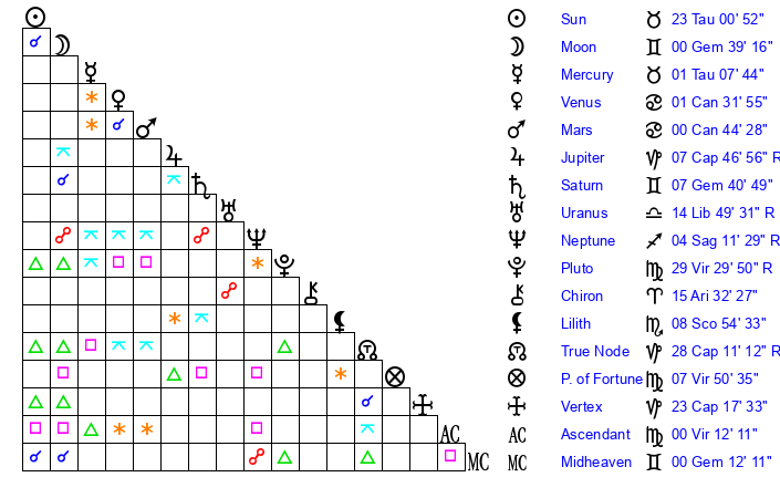 | Moon | 0 Gemini 39 | 4 Sagittarius 13 | 4 Taurus 27 |