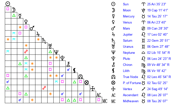 | Moon | 19 Capricorn 12 | 25 Scorpio 10 | 7 Capricorn 12 |