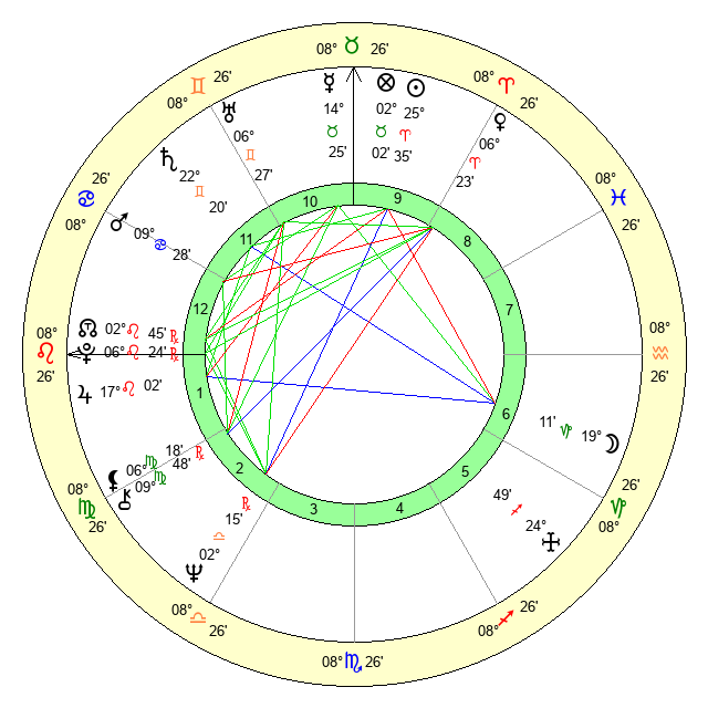 | Sun | 25 Aries 36 | 25 Aries 58 | 13 Cancer 31 |
