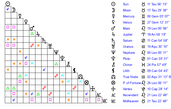 | Sun | 11 Taurus 56 | 12 Taurus 32 | 26 Leo 20 |