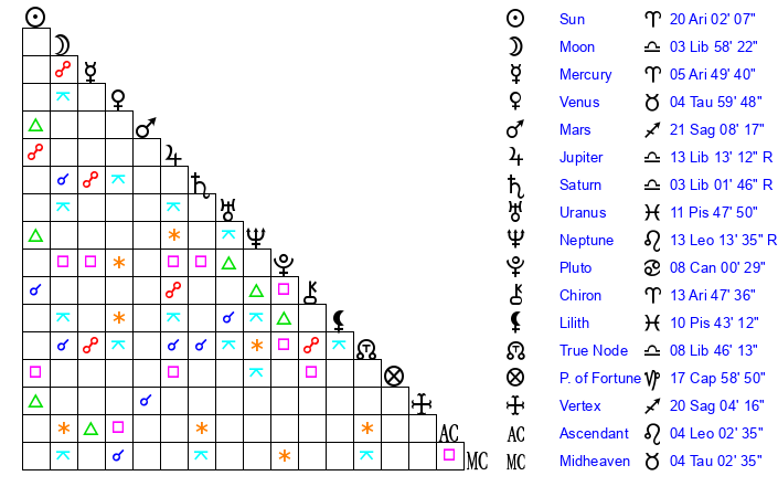 | Saturn | 3 Libra 46 | 25 Pisces 33 | 3 Libra 24 |
