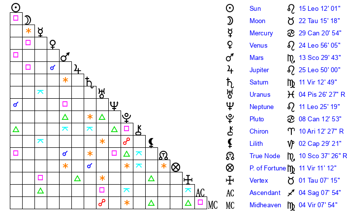 | Sun | 15 Leo 12 | 15 Leo 48 | 28 Scorpio 28 |
