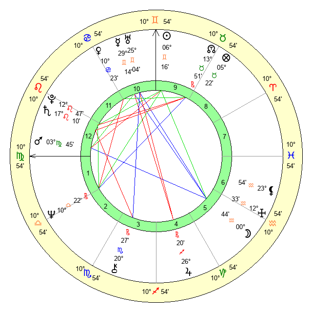 | Sun | 6 Gemini 17 | 6 Gemini 39 | 19 Leo 52 |