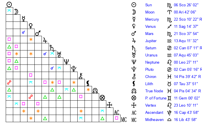 | Sun | 6 Scorpio 26 | 7 Scorpio 31 | 28 Aquarius 58 |