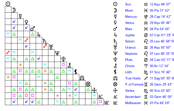 | Sun | 12 Aquarius 49 | 14 Aquarius 6 | 27 Taurus 39 |