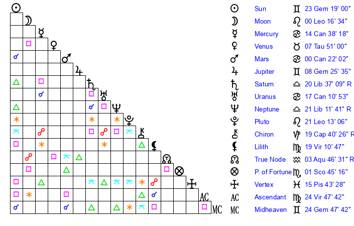 | Sun | 23 Gemini 19 | 23 Gemini 53 | 2 Virgo 10 |