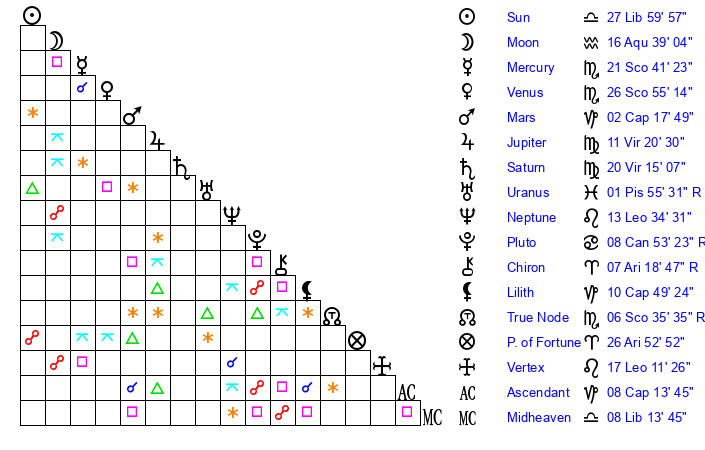 | Sun | 28 Libra 0 | 28 Libra 33 | 14 Aquarius 21 |