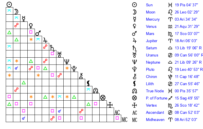 | Pluto | 19 Leo 40 | 3 Aquarius 6 | 19 Leo 11 |