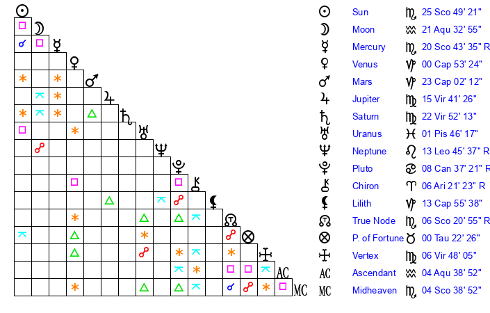 | Sun | 25 Scorpio 49 | 26 Scorpio 21 | 12 Pisces 20 |
