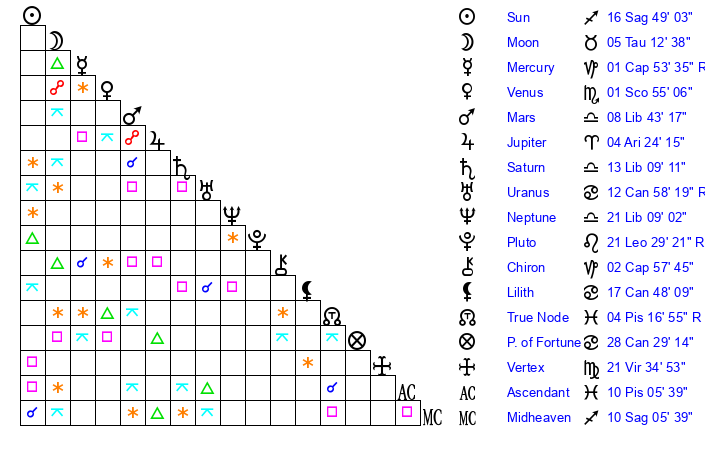 | Sun | 16 Sagittarius 49 | 17 Sagittarius 52 | 2 Pisces 1 |