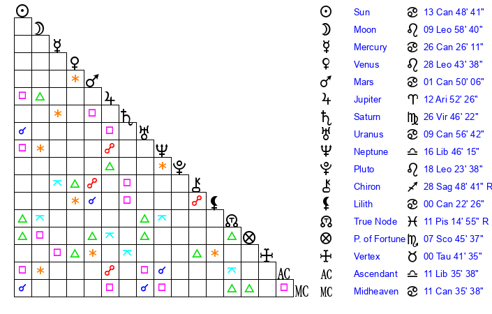 | Venus | 28 Leo 43 | 2 Gemini 17 | 2 Virgo 54 |