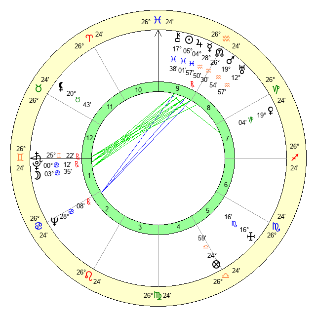 | Sun | 5 Pisces 1 | 6 Pisces 20 | 22 Gemini 32 |