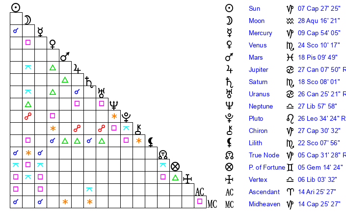 | Sun | 7 Capricorn 27 | 8 Capricorn 29 | 18 Pisces 21 |