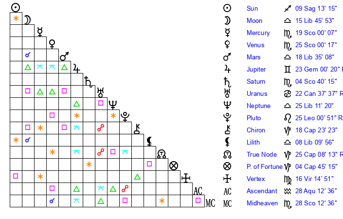| Sun | 9 Sagittarius 13 | 9 Sagittarius 45 | 22 Aquarius 26 |