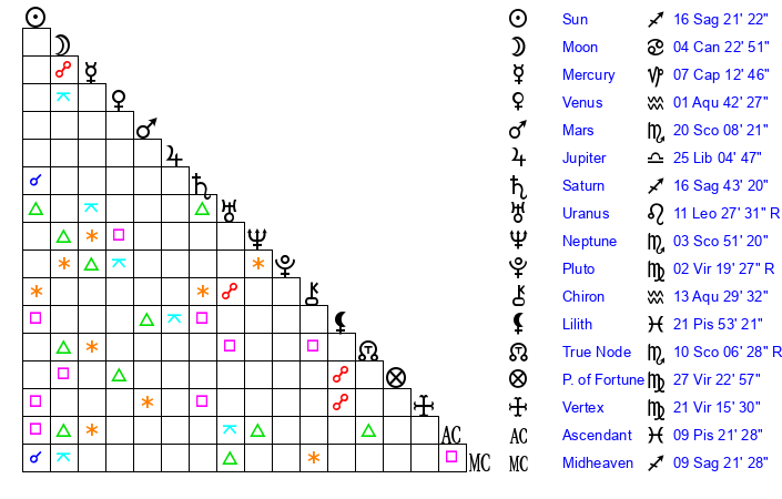 | Sun | 16 Sagittarius 21 | 16 Sagittarius 51 | 25 Aquarius 30 |